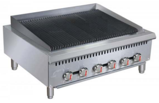 Commercial Kitchen Grill, Gas Lava Rock Broiler, Griller. Stainless steel front and sides. Cast iron straight burner, each 20,000 BTU/hr. Lava rock to retain heat. Standby S/S pilot. 5 1/4" wide cast iron grates, can be reversed for different food. Independent control valve for every 6” cooking zone. Adjustable heavy duty legs. Full width crumb tray at the bottom. Durable brass control valve. Easy access to pilot valve adjustment screws. Easy gas conversion in field. 3⁄4" NPT rear gas connection. Shipped with gas regulator and lava rock kit.